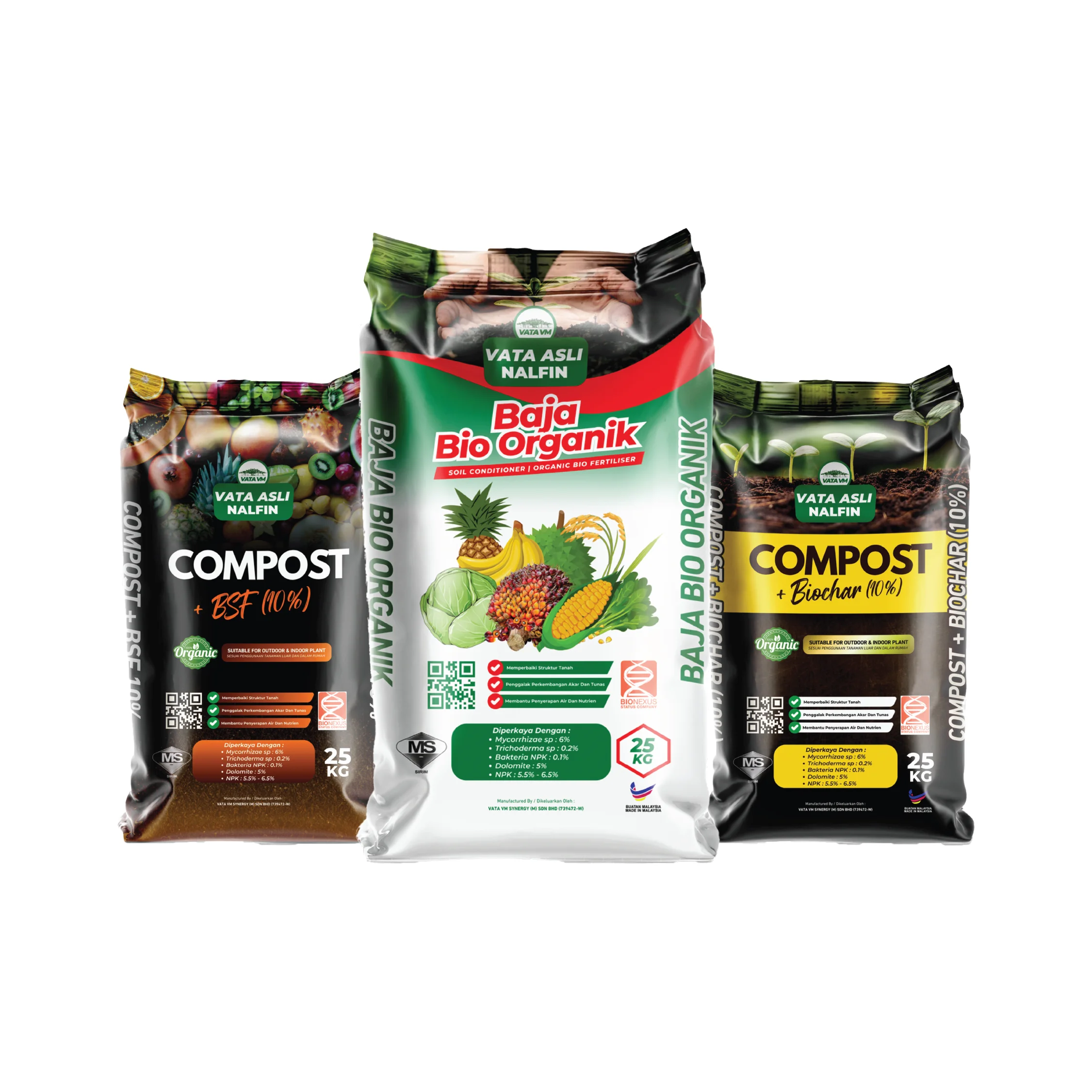 Baja Bio Organik dan BSF adalah campuran organik yang diperkaya dengan produk sampingan Black Soldier Fly untuk meningkatkan nutrisi tumbuhan, menguatkan imuniti, dan memperkayakan kesihatan tanah jangka panjang. Kelebihan: • Nitrogen yang lebih tinggi serta ketersediaan P dan K yang diperbaiki untuk pertumbuhan, perkembangan akar, dan pembuahan yang lebih kukuh. • Chitin semula jadi dan mikroba bermanfaat untuk meningkatkan imuniti tumbuhan serta menindas serangga dan penyakit. • Menghasilkan humus yang lebih kaya serta menyokong struktur tanah yang tahan lama dan kesuburan.